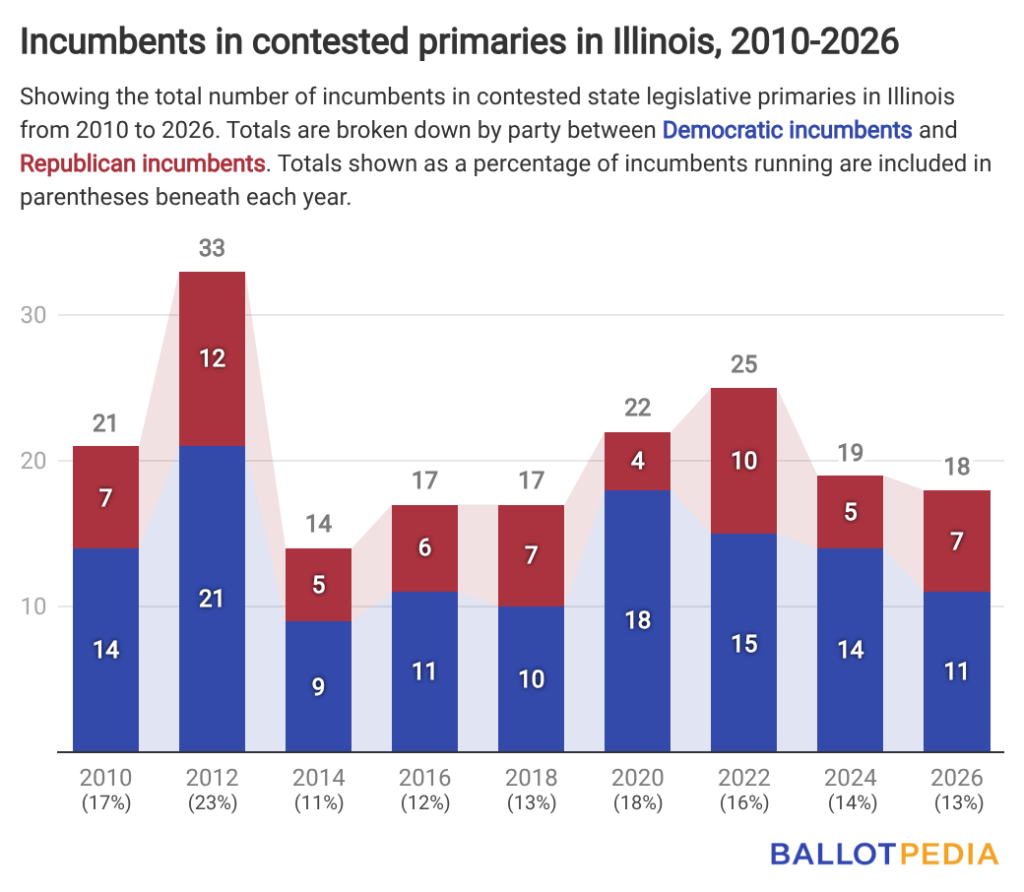 In 2026, 12.7% of the state legislative incumbents running for election in Illinois will face primary contests, down from 14.4% in 2024 and the lowest percentage since 2016, when 11.8% of incumbents faced primaries.