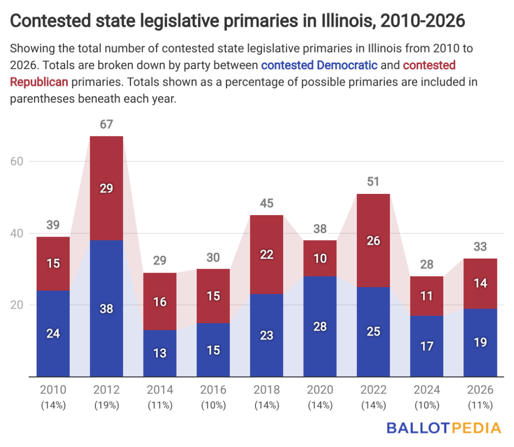 Illinois has 33 contested state legislative primaries in 2026, an 18% increase from 28 in the preceding cycle.