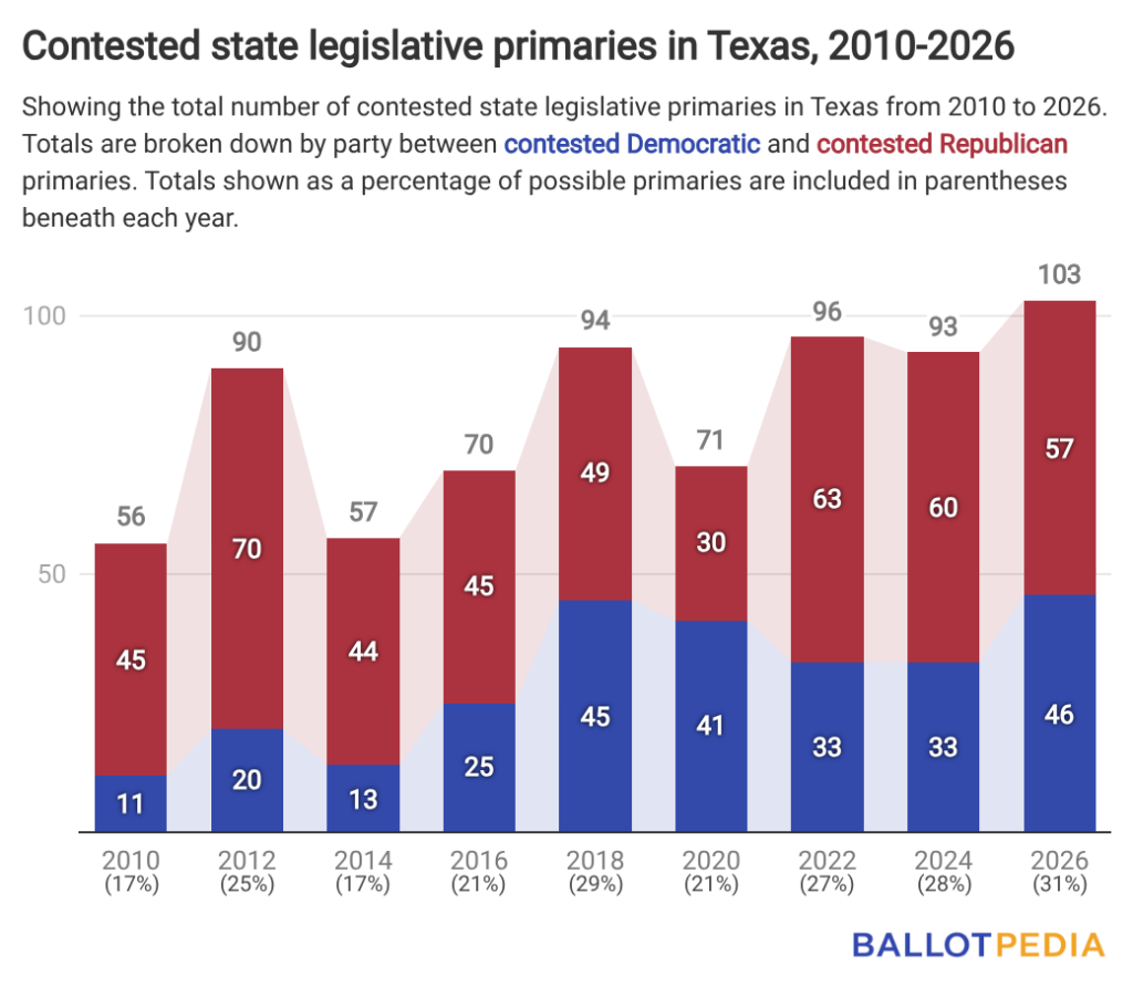 Texas also has 103 contested state legislative primaries this year, an 11% increase from the previous cycle and the most since 2010. Forty-six of the 103 contested primaries are for Democrats. That is a 39% increase from 33 in 2024 and a record high for the party. Republicans have 57 contested primaries, down 5% from 60 in 2024.
