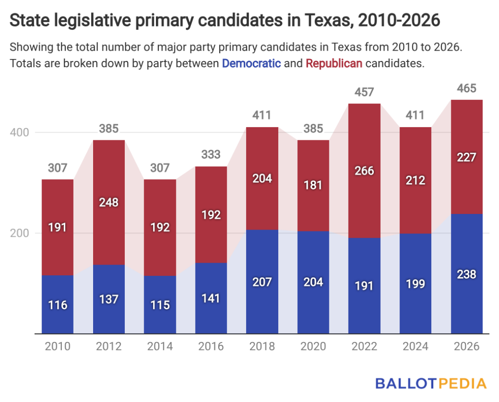 Texas has 465 major party candidates running for state legislative office, the most of any election cycle since 2010. Of the 465 total candidates, 238 are Democrats, up 20% from 199 in 2024. There are 227 Republican candidates, up 7% from 212 in 2024.