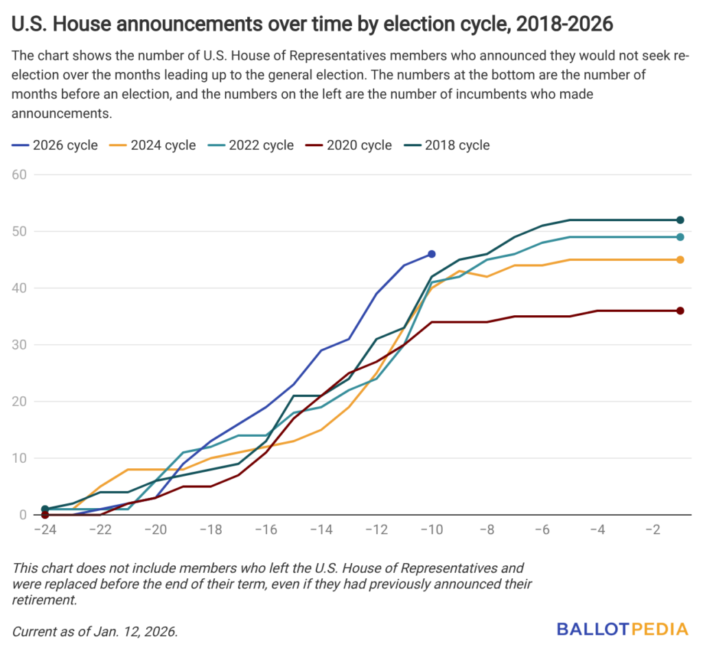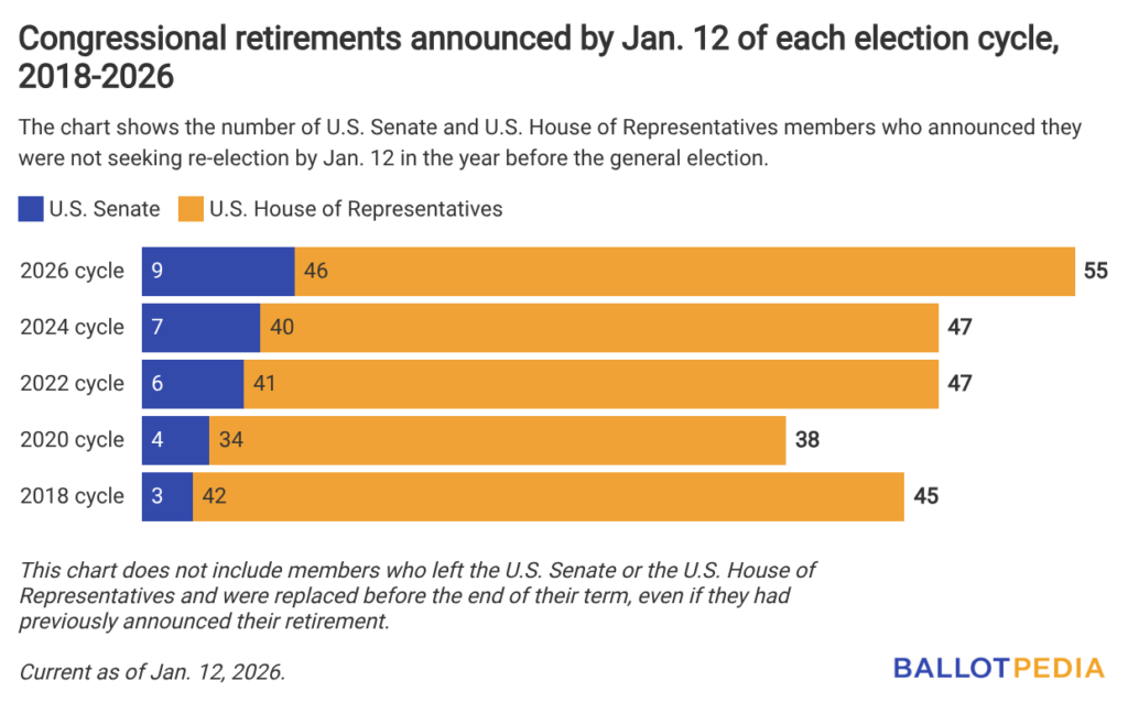 As of Jan. 12, 55 members of Congress — 46 representatives and nine senators — have announced they will not seek re-election in 2026. That’s the most retirement announcements at this point in an election cycle since 2018.