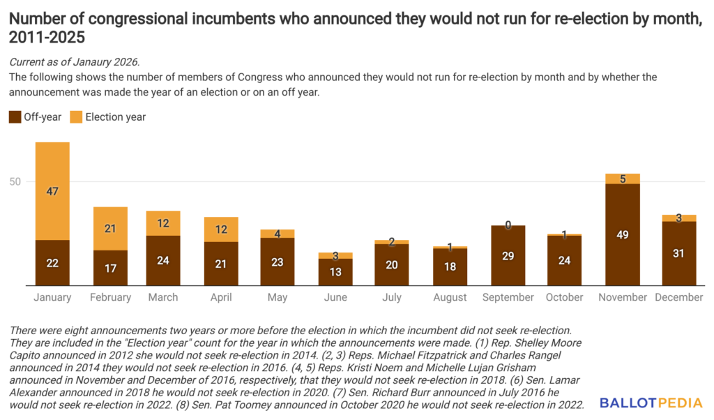 Between January 2011 and January 2026, 400 U.S. Senate and House incumbents announced they would not seek re-election. The 69 retirement announcements in January is the most of any month. June had the fewest at 16.