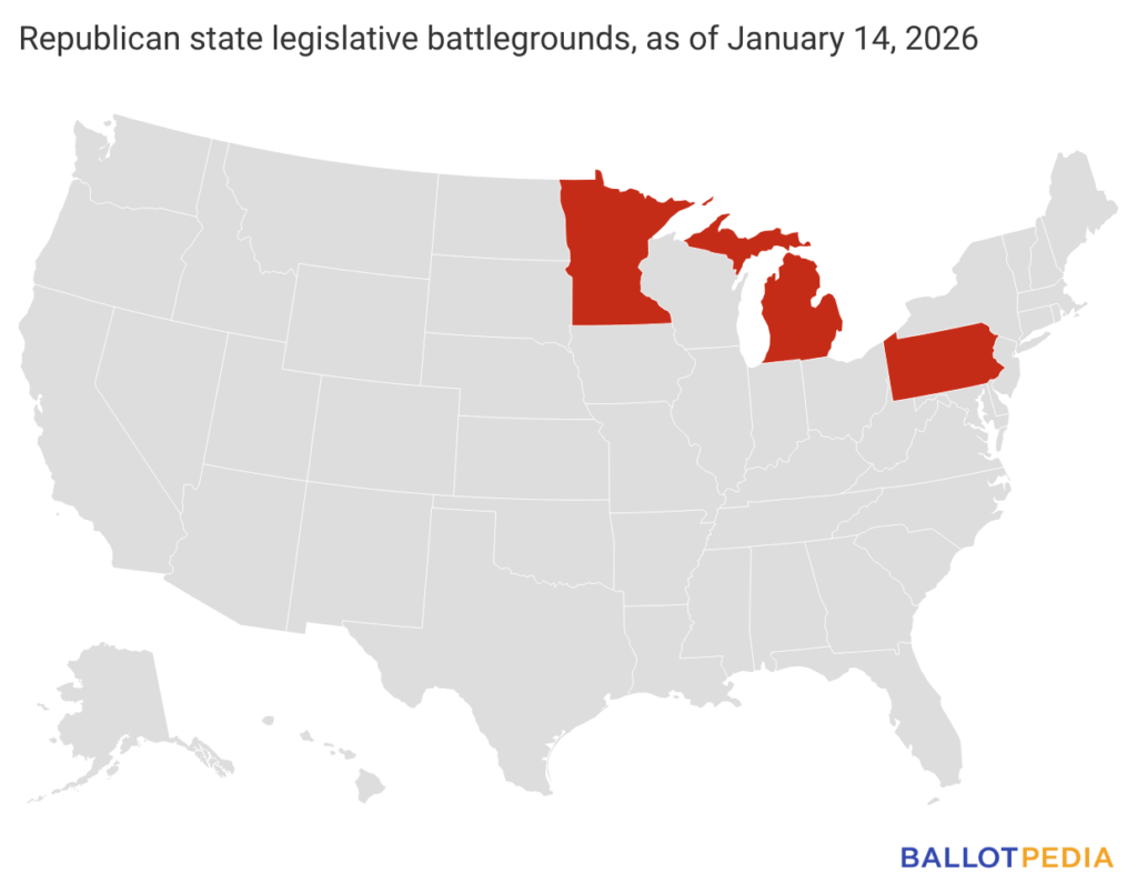 Republicans made gains in Michigan and Minnesota in the 2024 elections. In Michigan, Republicans won control of the House in 2024, and they are now targeting the Senate, which they last controlled in 2022 and are currently two seats short of a majority. In Minnesota, Republicans won enough seats in the House in 2024 that the chamber is split evenly between the parties.
