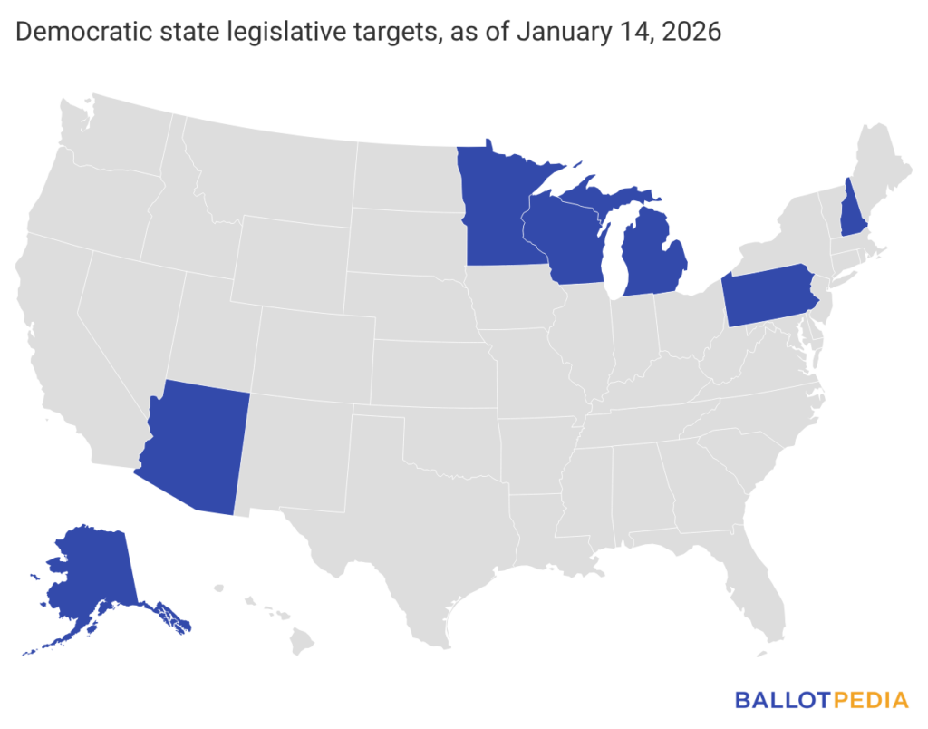 The Democratic Legislative Campaign Committee has announced a full list of targeted states on its website. Their site lists 36 states of interest, seven of which the organization considers as battlegrounds: Alaska, Arizona, Michigan, Minnesota, New Hampshire, Pennsylvania, and Wisconsin.