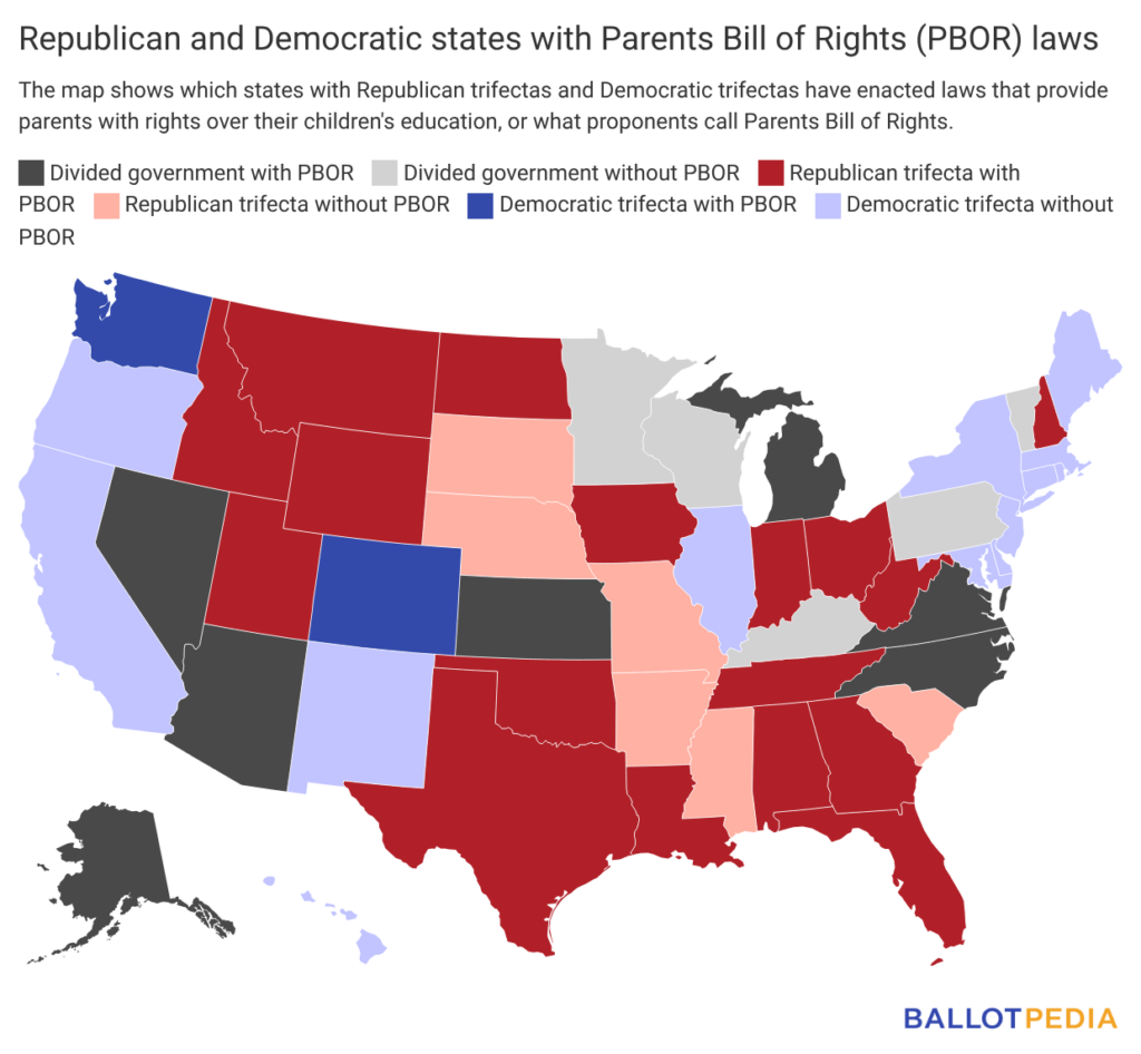As of January 2026, 26 states, including Washington, have enacted a statewide Parents' Bill of Rights. These laws vary from state to state but generally grant parents specific rights as they pertain to their children's education. States with Republican trifectas are more likely than those with divided governments or Democratic trifectas to have enacted Parents’ Bill of Rights laws. Currently, 17 of 23 states with Republican trifectas have a Parents’ Bill of Rights law, whereas two of the 14 states with Democratic trifectas have done so. Washington and Colorado are the only two Democratic trifecta states with a Parents’ Bill of Rights law.