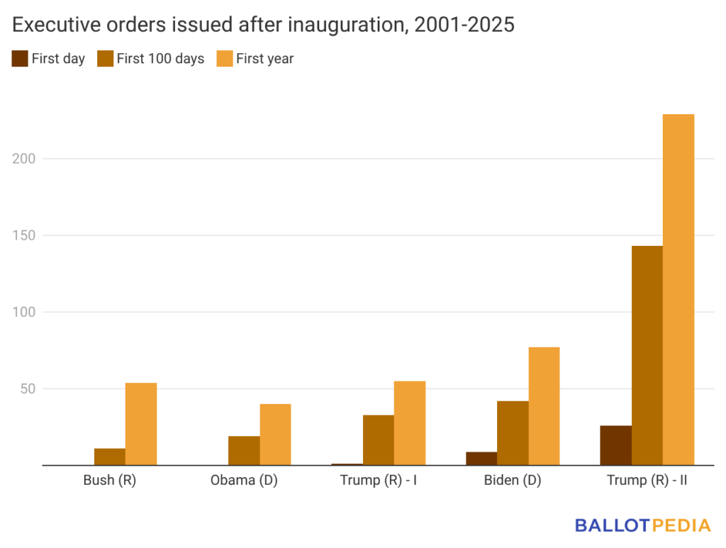 As of Jan. 16, Trump issued 229 executive orders, 57 presidential memoranda, and 118 proclamations in the first year of his second term. Trump’s executive order total was the highest first-year executive order total since Franklin Delano Roosevelt (D), who issued 568 executive orders in 1933. Looking at his second term executive orders by topic, Trump has issued the most executive orders on foreign policy at 61 orders, 35 of which were related to trade and tariffs.