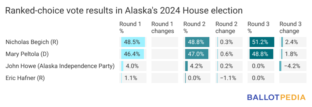 • In November 2024, Nicholas Begich (R) defeated Peltola 51% to 49% in the third round.