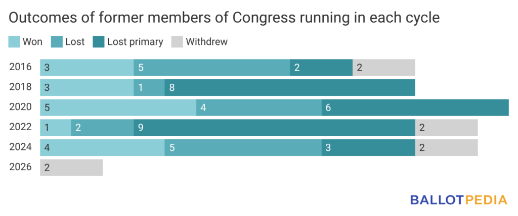 More former members of Congress have announced candidacies in the 2026 election cycle than in any cycle since 2016, with 22 total members running. The next highest cycles are 2020 and 2024, with 15 members each. The cycle with the fewest former members running was 2016 and 2018, with 12 members each.