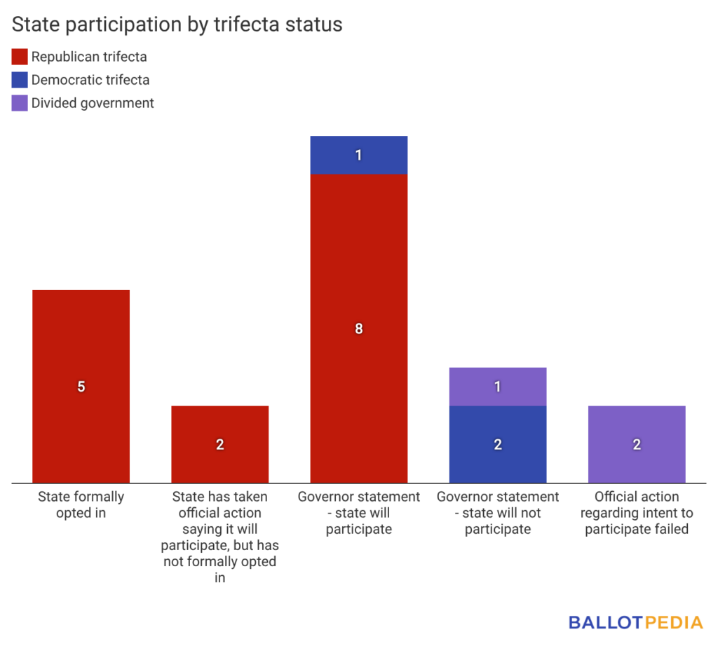 - Eight states—Arkansas, Indiana, Iowa, Louisiana, North Dakota, South Dakota, Tennessee, and Texas—have said they will participate in the program, but have not taken official action.