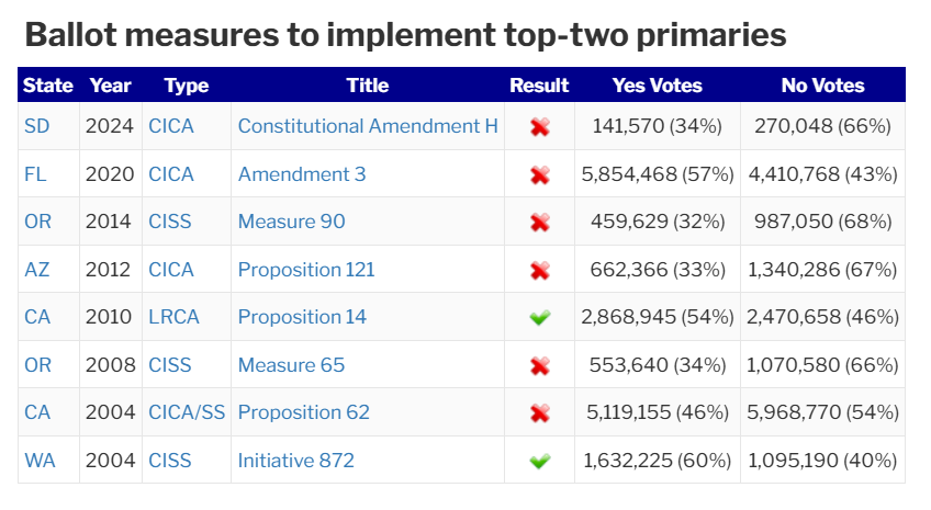 Between 2004 and 2025, six states have decided on eight ballot measures to implement top-two primary systems. Voters in California and Washington approved the measures. The other six measures were defeated. On average between the eight measures, 43.8% of voters approve the measure and 56.2% reject the measure.