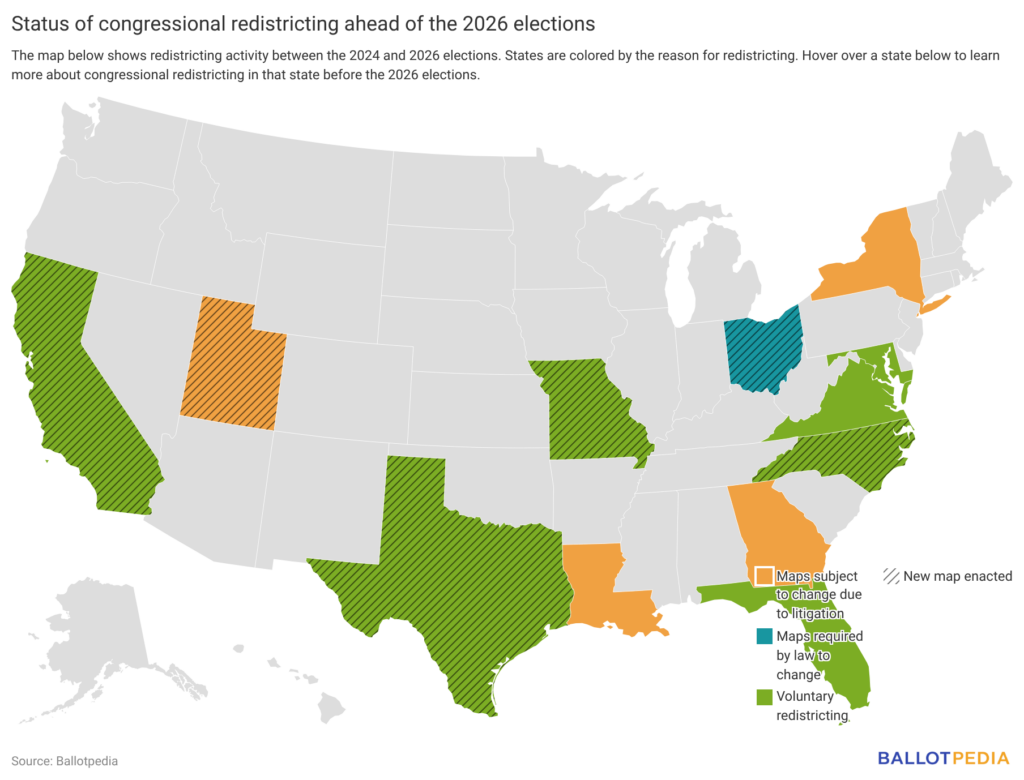 Six states have already revised their congressional maps ahead of the 2026 elections. Four states—California, Missouri, North Carolina, and Texas—voluntarily passed new congressional maps. Ohio was required by law to adopt a new map. New York would join Utah as the second state to have litigation lead to a new map. The redraw could create an additional Democratic district ahead of the 2026 elections, bringing Republicans' net gain from redistricting nationwide to two districts.