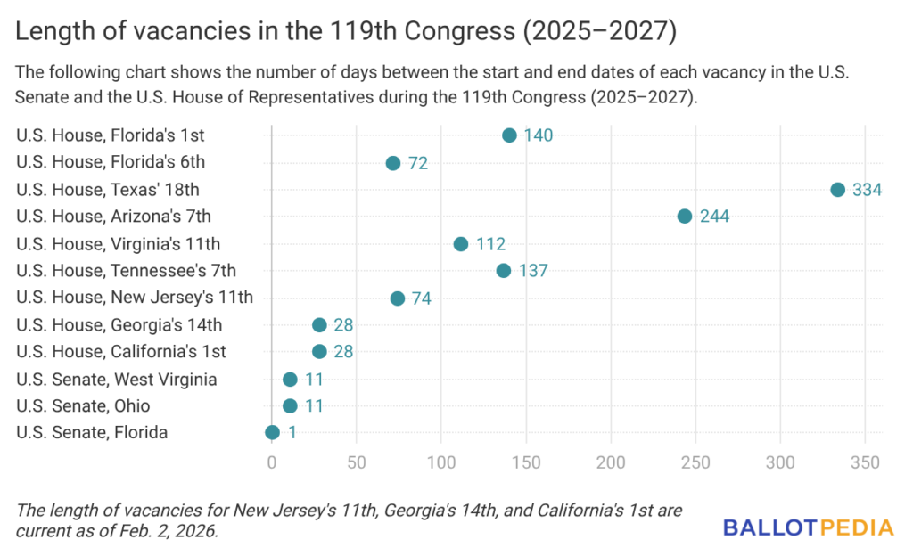As of Feb. 2, 2026, three vacancies in California's 1st Congressional District, Georgia's 14th Congressional District, and New Jersey's 11th Congressional District have not been filled.