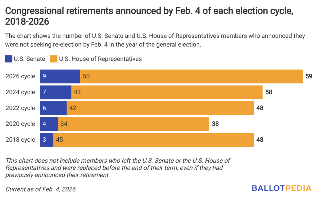 Between January 2011 and February 2026, Ballotpedia tracked 352 announcements by U.S. House members that they would not seek re-election. January had the highest number of members announcing they would not run for re-election at 61. The fewest announcements took place in June at 15.