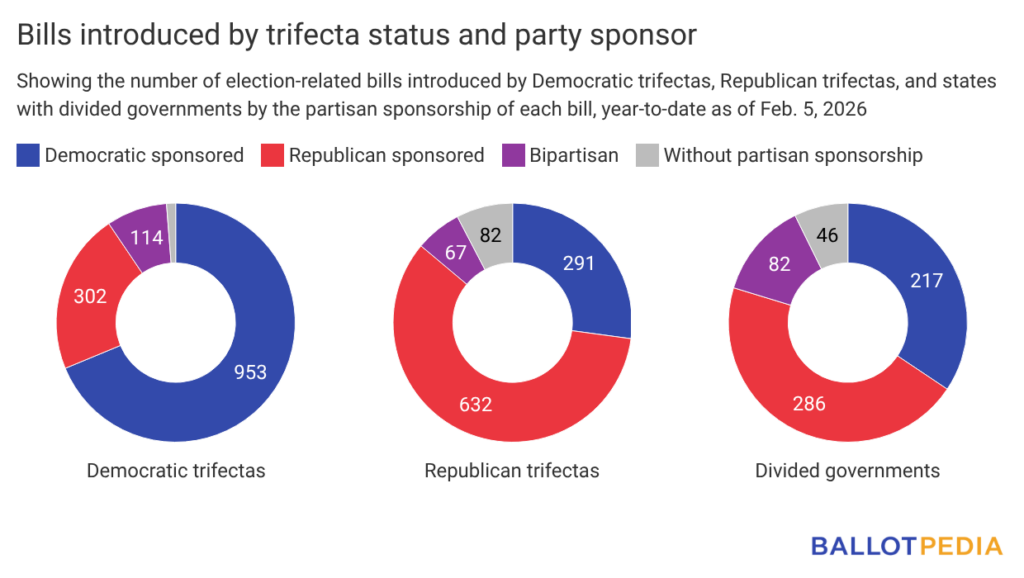 See the charts below for a comparison of total bills between 2024 and 2026 and a breakdown of all 2026 legislation by trifecta status and partisan sponsorship.