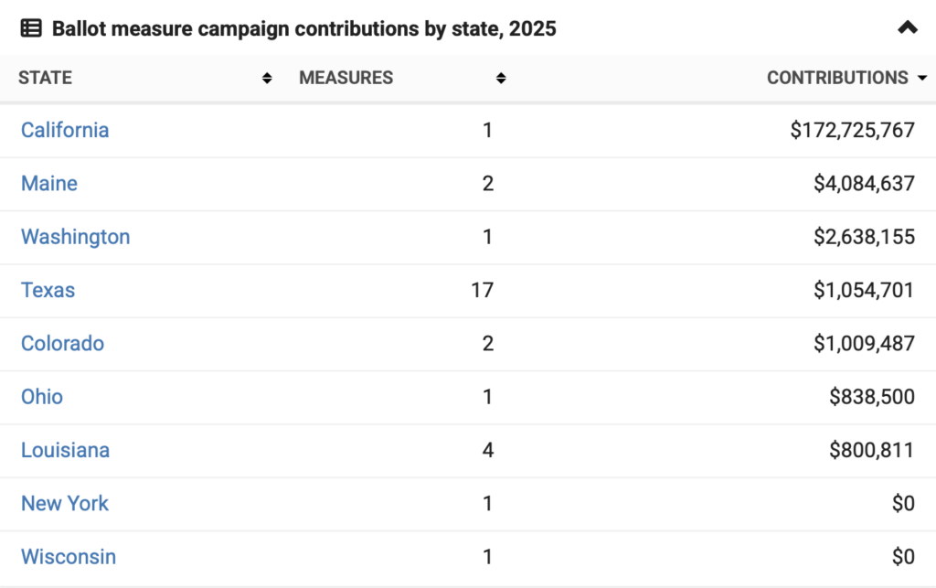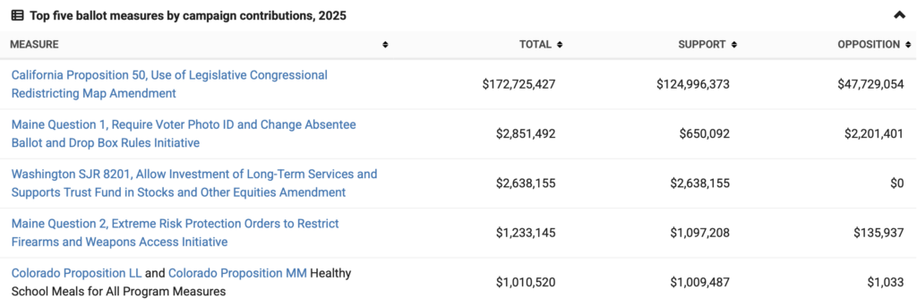 Besides California Prop 50, the other two most expensive ballot measures in 2025 were Maine Question 1, with $2.8 million in contributions, and Washington SJR 8201, with $2.6 million in contributions. These were followed by Maine Question 2, with $1.2 million in total contributions, and the campaigns around Colorado Proposition LL and Proposition MM, with $1.01 million for each measure.