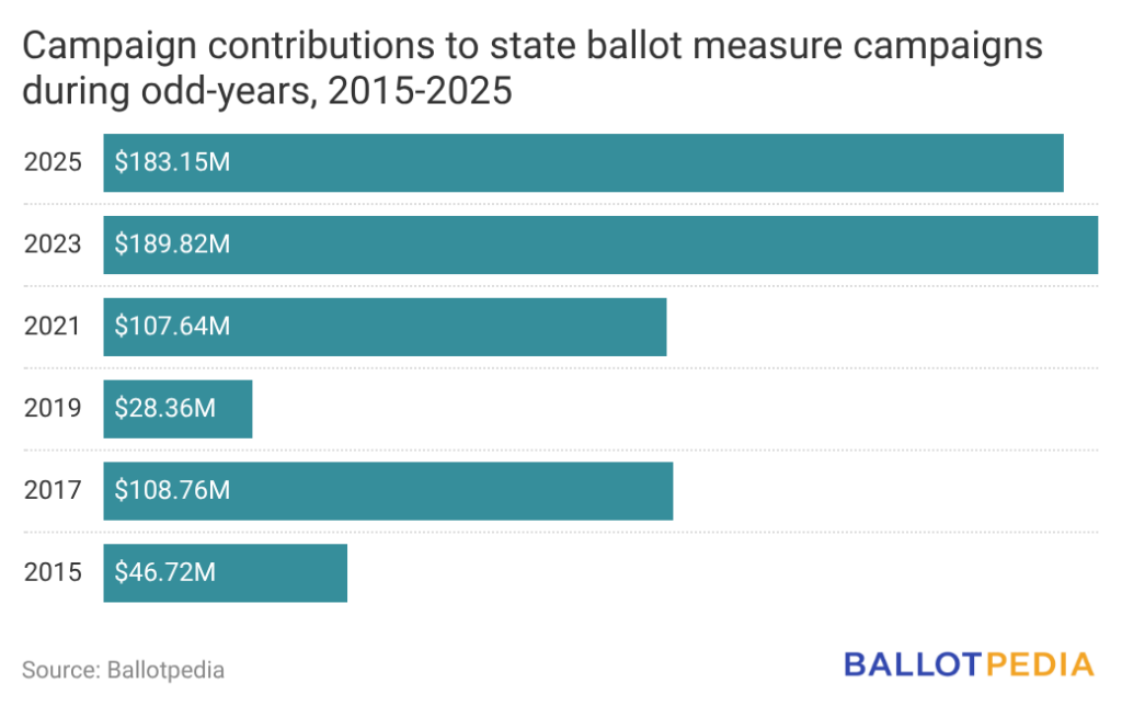 In 2025, campaigns supporting and opposing 30 statewide ballot measures in nine states received $183.15 million in contributions.