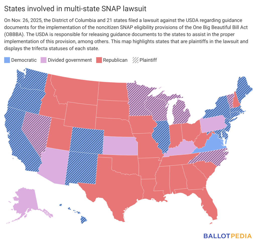 Minnesota has also been involved in additional SNAP-related litigation. On Nov. 26, 2025, the District of Columbia and 21 states, including Minnesota, filed a different lawsuit against the USDA regarding guidance documents for the implementation of the SNAP provisions of the One Big Beautiful Bill Act (OBBBA). Plaintiffs include: New York, Oregon, California, Colorado, Connecticut, Delaware, the District of Columbia, Hawaii, Illinois, Maine, Maryland, Massachusetts, Michigan, Minnesota, Nevada, New Jersey, New Mexico, North Carolina, Rhode Island, Vermont, Washington, and Wisconsin.