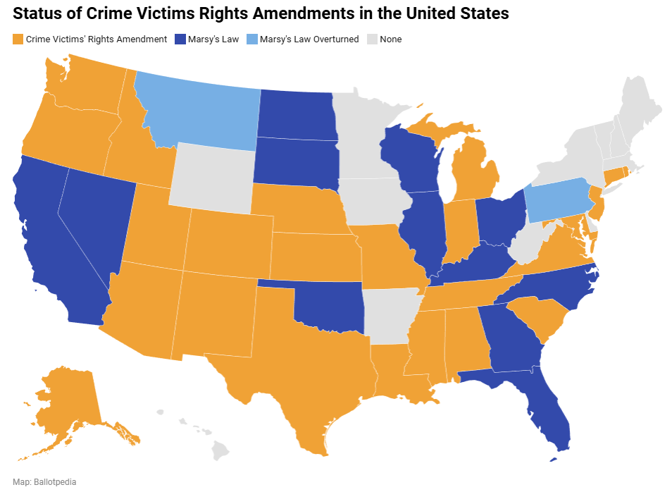 Of the 57 constitutional amendments on the ballot since 1982, 33 added a crime victims' bill of rights, 15 added Marsy's Law, three added a single right for victims of crimes, four amendments expanded the rights of crime victims in states with preexisting Marsy's Law or crime victims' bill of rights amendments, and two limited or would have limited the rights of crime victims in states with preexisting amendments.