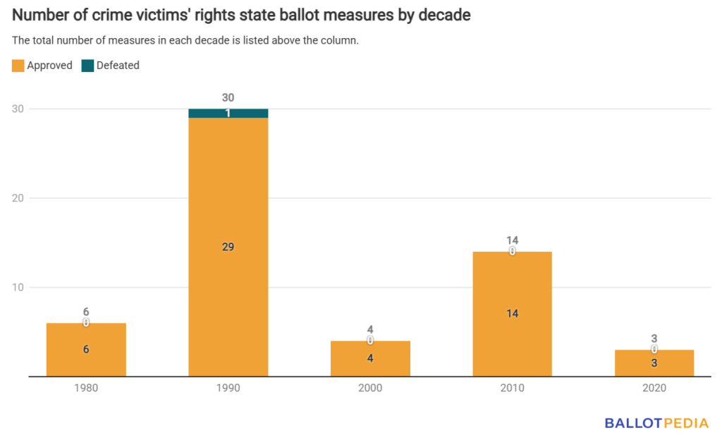 Since 1982, voters in 39 states have voted on 58 ballot measures concerning crime victims' rights. These measures include those related to the legal rights and protections of crime victims. They address a right to restitution, notification, participation in legal proceedings, and victim support services, among other rights guaranteed to victims of crimes.