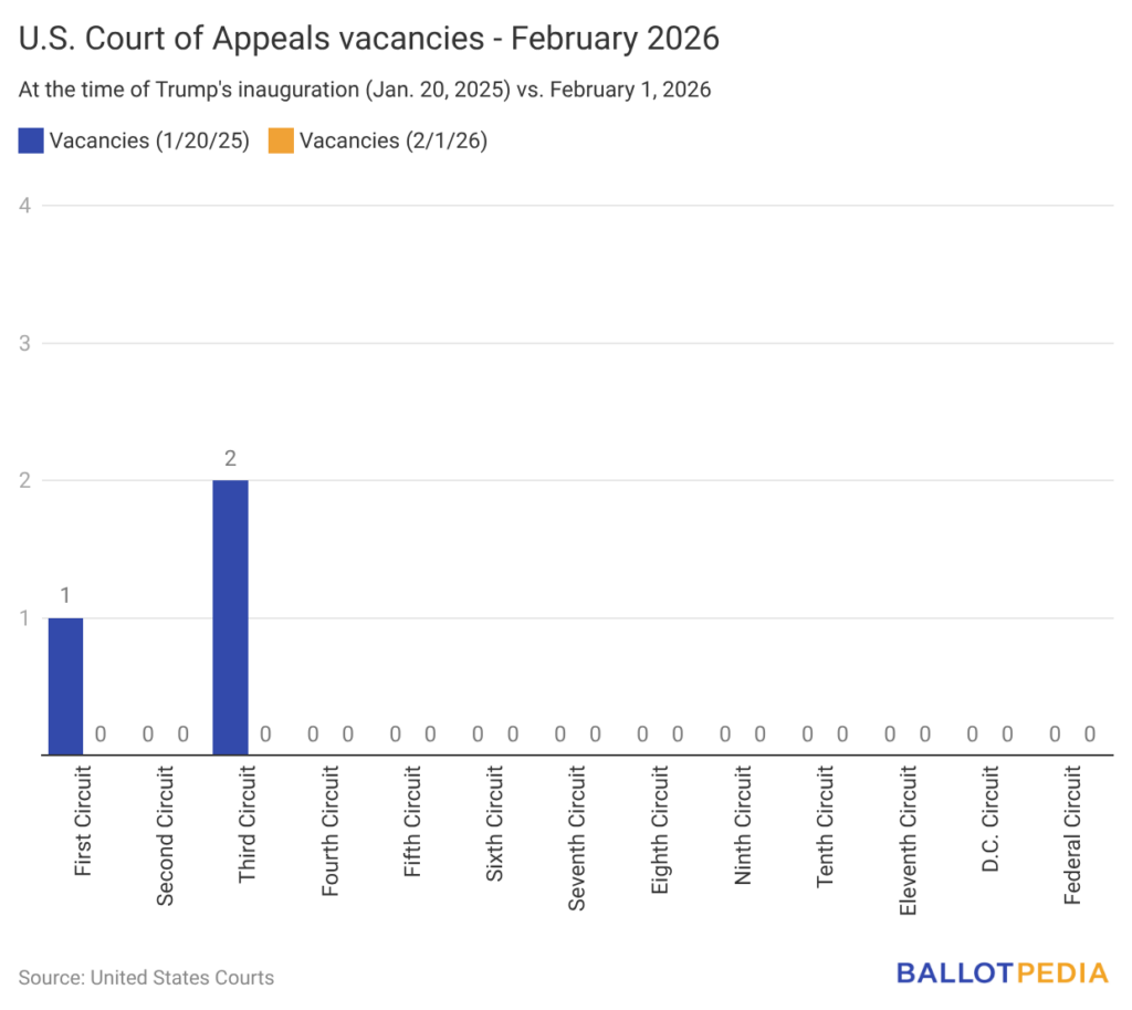 The following chart tracks the number of vacancies in the U.S. Courts of Appeals from President Donald Trump's (R) inauguration to the date indicated on the chart.