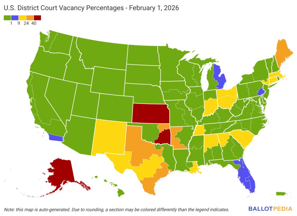 The following map shows the number of vacancies in the U.S. District Courts as of Feb. 1.