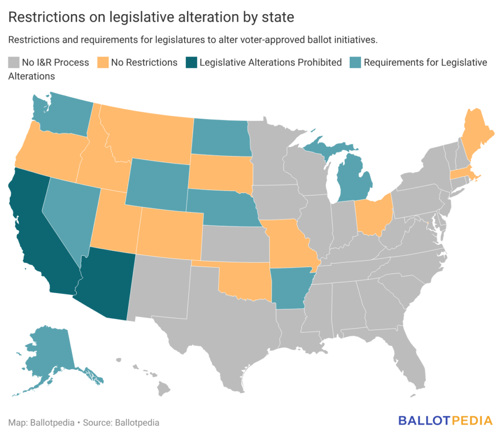 Twenty-one states have initiated state statutes. Eleven of these states have no restrictions on legislative alteration. Arizona and California require voter approval of substantive alteration. The remaining eight states have either time restrictions, supermajority vote requirements, or a combination of the two.