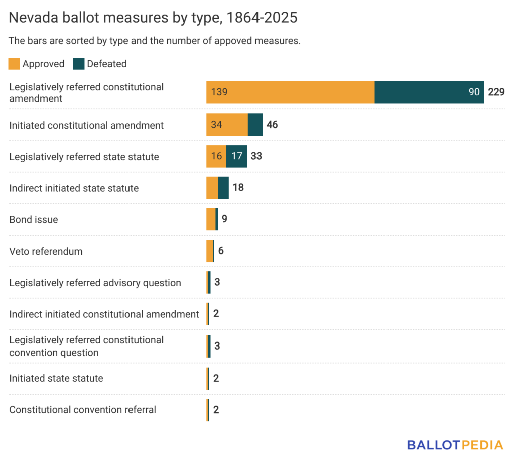 Today, let’s look at historical ballot measures in Nevada. Our comprehensive inventory of Nevada ballot measures spans from 1864 to 2025. In that time, Nevada voters approved 215 measures and defeated 138 — a 60.9% approval rate.