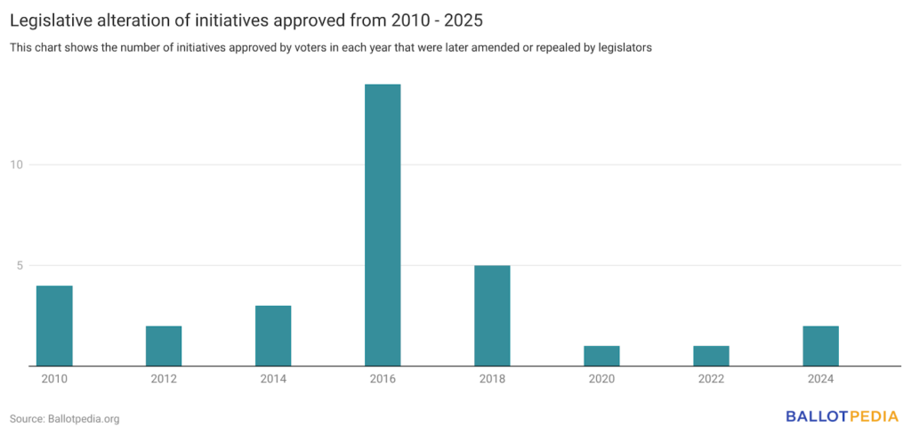 The year with the most initiatives that were later amended or repealed was 2016. Click here to see a list of altered measures by year and state.