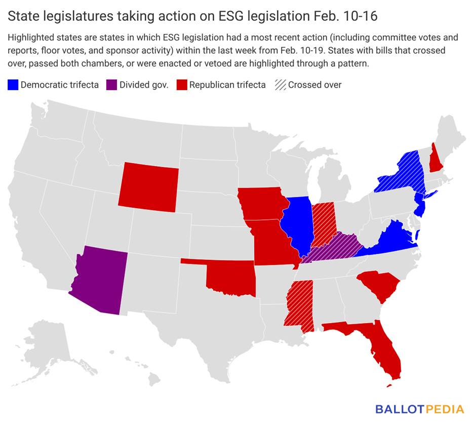 Fifteen states took action on 27 ESG-related bills last week (since Feb. 10).