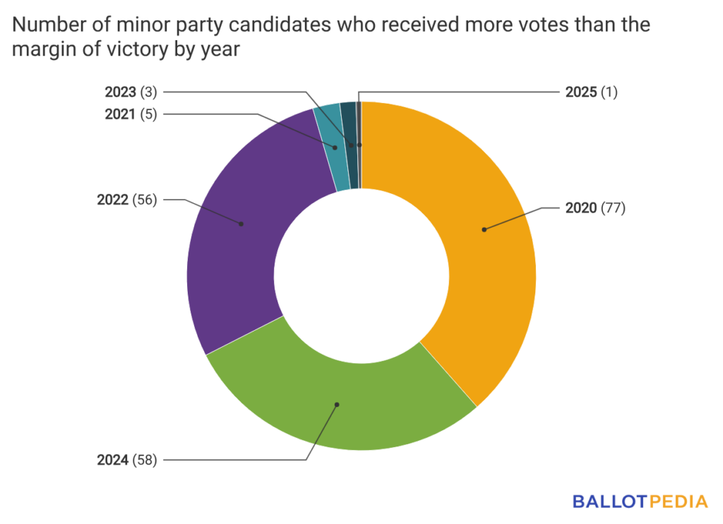 In 2025, just one minor party candidate received more votes than the margin of victory in an election. This is the smallest number in any election since 2020.