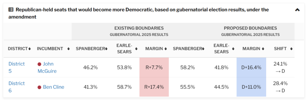 Under the constitutional amendment and HB 29, two Republican-held congressional districts would shift to become more Democratic, based on gubernatorial election results from 2025. Spanberger would have won both—District 5 and District 6—with margins above 10%.
