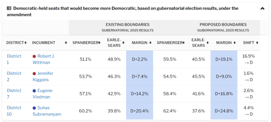 Under the constitutional amendment and HB 29, four Democratic-held congressional districts would shift to become more Republican, based on the 2025 gubernatorial election results. Spanberger still would have won all four districts, with margins of at least 11%.