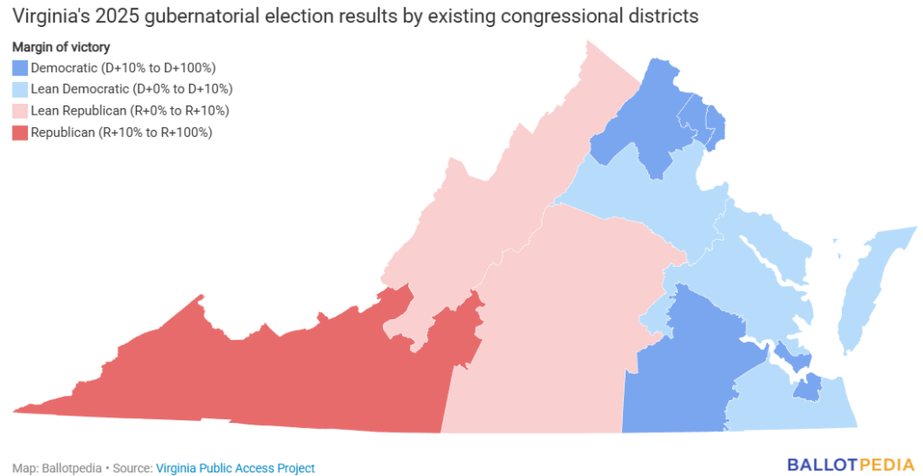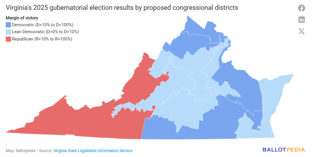 Under the proposalmap, one Republican-held congressional district would shift to become more Republican, based on the gubernatorial election results from 2025. The change in election results in District 9, of which Earle-Sears won with a margin greater than 18%, is less than three percentage points.