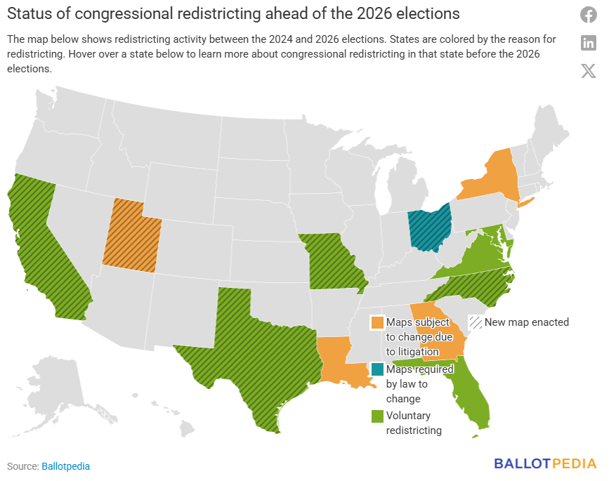 As of February 2026, six states changed congressional maps before the 2026 elections—California, Missouri, North Carolina, Ohio, Texas, and Utah. Three states had taken official action toward voluntary redistricting, and three states had congressional maps that were subject to change due to litigation. Before 2025, only two states had conducted voluntary mid-decade redistricting since 1970.