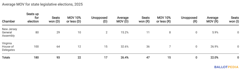 The Nov. 4, 2025, state legislative elections included all 100 seats in the Virginia House of Delegates and all 80 seats in the New Jersey General Assembly. The average margin of victory in the New Jersey General Assembly was 12.5%, and the average margin of victory in the Virginia House was 30.2%.