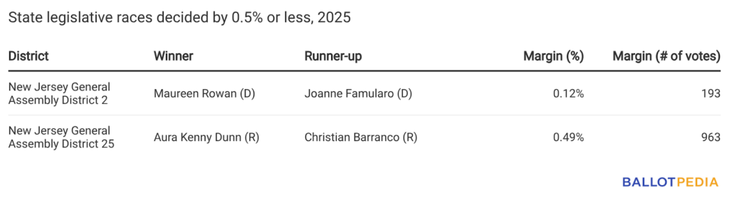 Of the 37 state legislative races decided by a margin of victory of 10% or less in 2025, Democrats won 22 (59.5%), and Republicans won 15 (40.5%). In 2023, Democrats won 35.7% of races with margins of victory of 10% or less, and Republicans won 64.3%.
