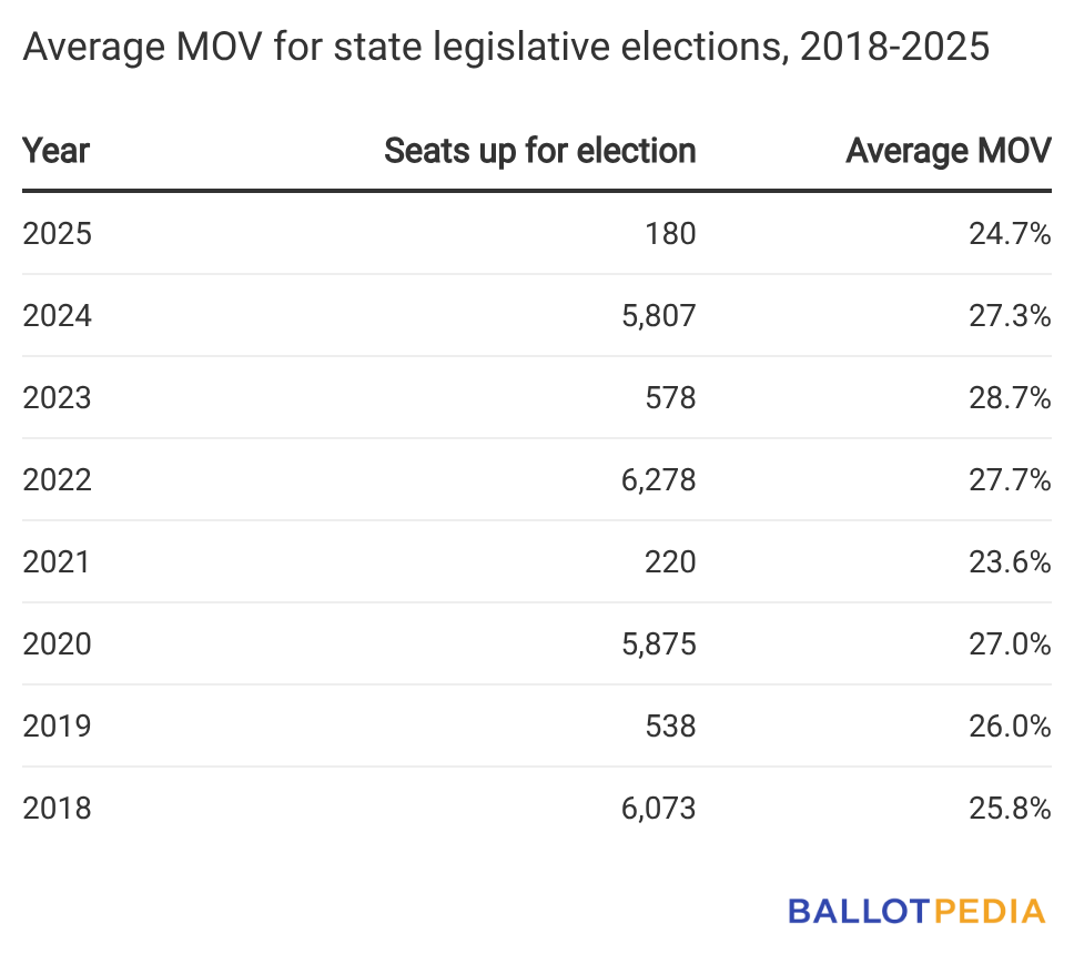 The average margin of victory across 2025’s state legislative elections was 24.7%, down from 28.7% in 2023