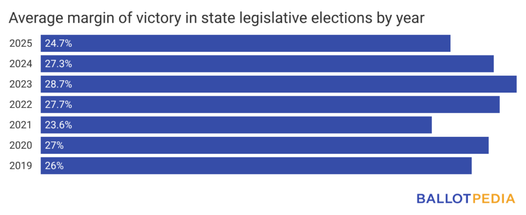 The average margin of victory across 2025’s state legislative elections was 24.7%, down from 28.7% in 2023
