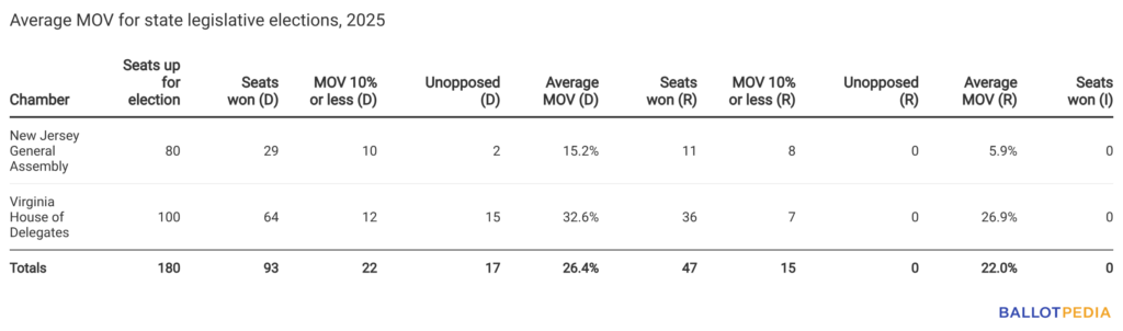 The Nov. 4, 2025, state legislative elections included all 100 seats in the Virginia House of Delegates and all 80 seats in the New Jersey General Assembly. The average margin of victory in the New Jersey General Assembly was 12.5%, and the average margin of victory in the Virginia House was 30.2%.