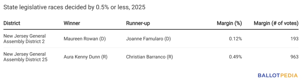 Two races—both in New Jersey—were decided by a margin of 0.5% or less.