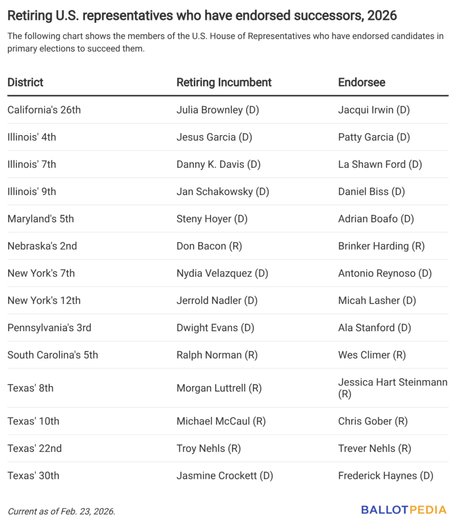 Fourteen of the 51 U.S. representatives (27.5%) who are not seeking re-election this year have endorsed a candidate in the respective primaries to succeed them. Nine of those endorsed candidates are Democrats, and five are Republicans.