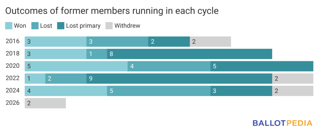 Since 2016, the most successful year for former members was 2020, when five former members won again. The least successful year was in 2022, when one member won a non-consecutive term. The most common outcome in three cycles — 2018, 2020, and 2022 — was a defeat in the primary. In 2016 and 2024, the most common result was a defeat in the general election.