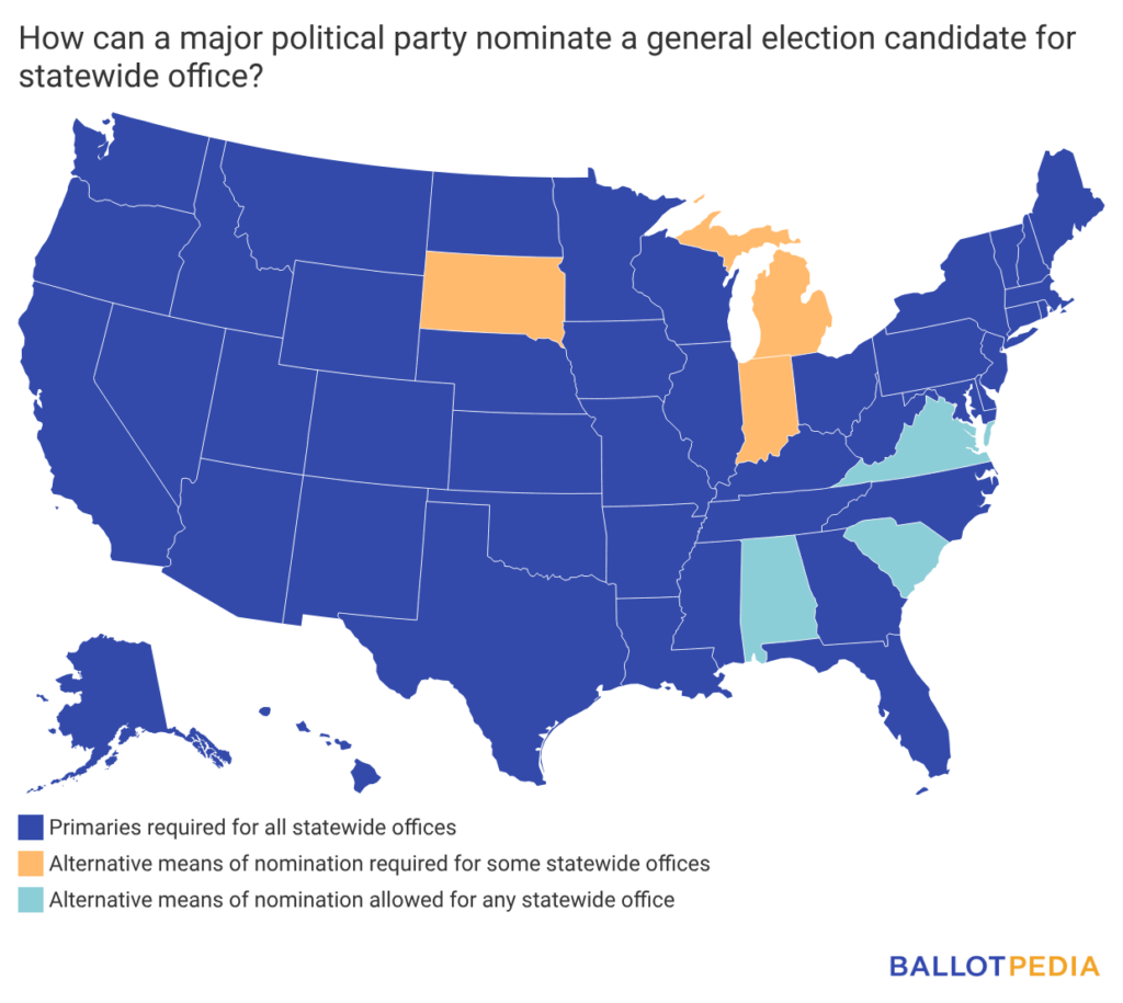 In Alabama, South Carolina, and Virginia, major political parties may nominate candidates for any statewide office without holding a primary. In Alabama, the party must provide advance notice to the state that it will be foregoing a primary election, while in South Carolina, a party must submit the question of nominating candidates via convention to voters. Neither major party has taken these steps for 2026.