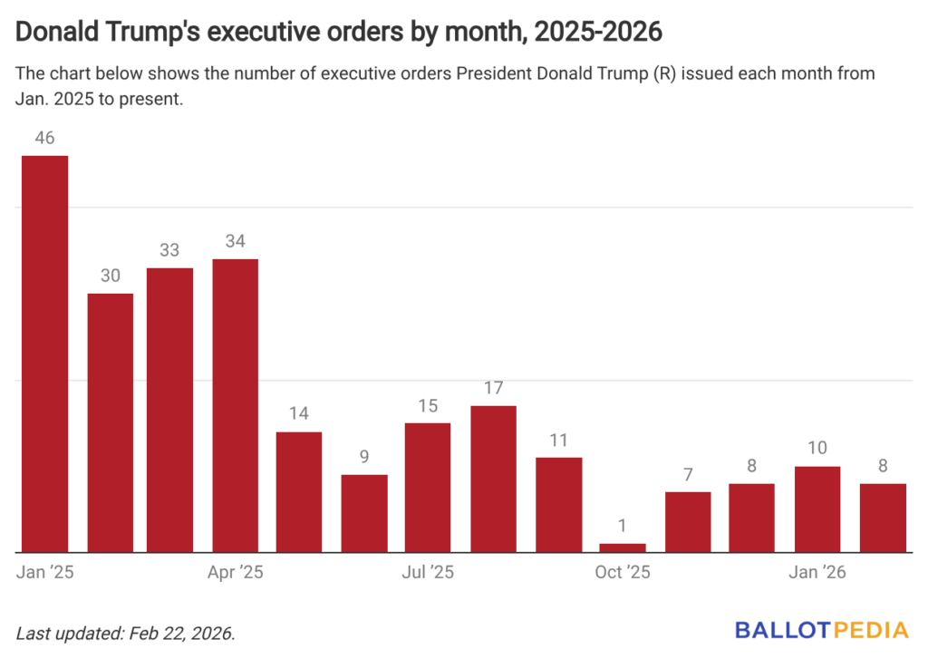 President Donald Trump (R) issued eight executive orders in February, bringing his total to 243 in his second term. This was tied for the third-lowest monthly total of his second term thus far.