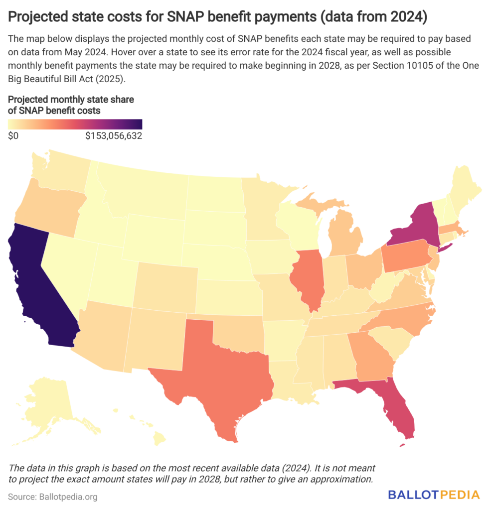 Section 10105 of the OBBBA established a performance-based cost-share system that ties state financial responsibility to payment error rates. Historically, the federal government has paid for the full cost of SNAP benefits and has split administrative costs with the states. Beginning in FY2028, states will be required to pay a share of SNAP benefit costs if their error rate exceeds 6%. States with error rates from 6% to 8% will pay 5% of benefits. States with 8% to 10% will pay 10% of benefits. States with error rates of more than 10% will pay 15% of the cost of benefits. For states with error rates of less than 6%, the federal government will continue to pay all of SNAP benefit costs.