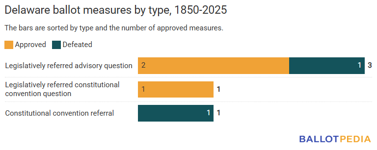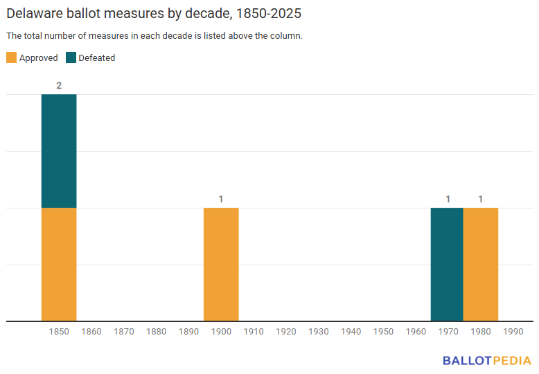 Ballotpedia completed an inventory of all Delaware ballot measures dating back to 1850. Between 1850 and 2025, Delaware voters decided on five ballot measures—the fewest of any state. Of those, three were approved, and two were defeated.