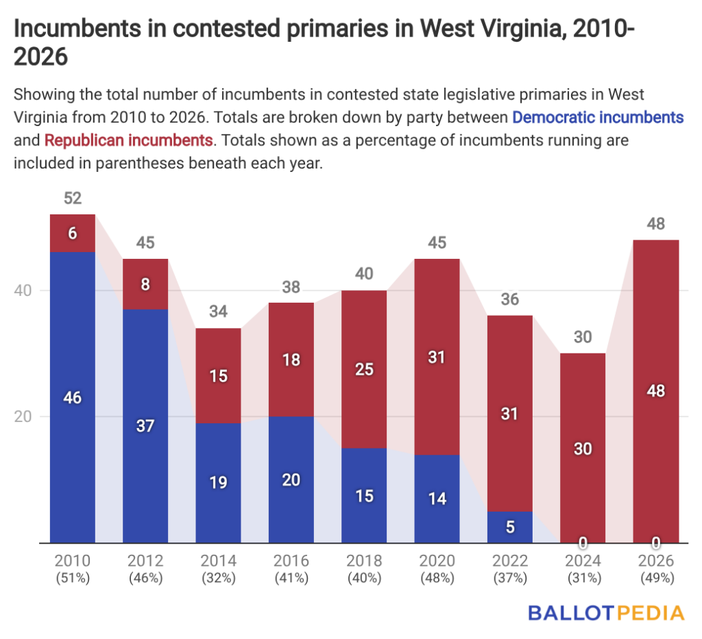 In 2026, 48.5% of the state legislative incumbents running for election in West Virginia will face primary contests, the highest share since 50.5% of incumbents faced challenges in 2010.