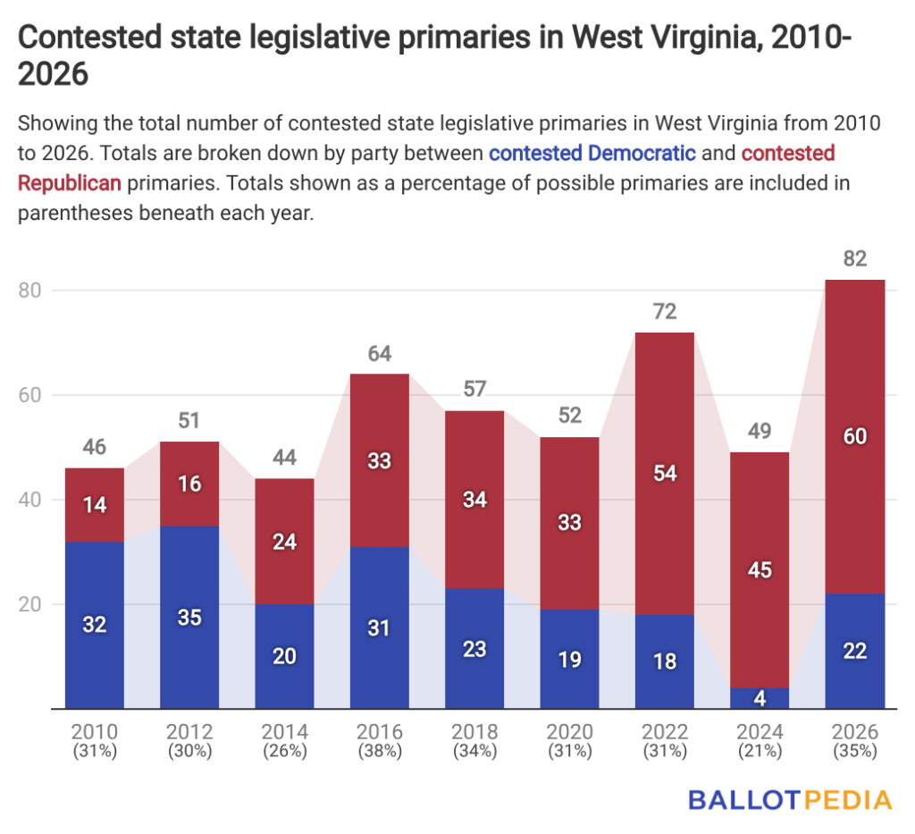 West Virginia has 82 contested state legislative primaries in 2026, a 67% increase from 49 in the preceding cycle and the most of any cycle since 2010.