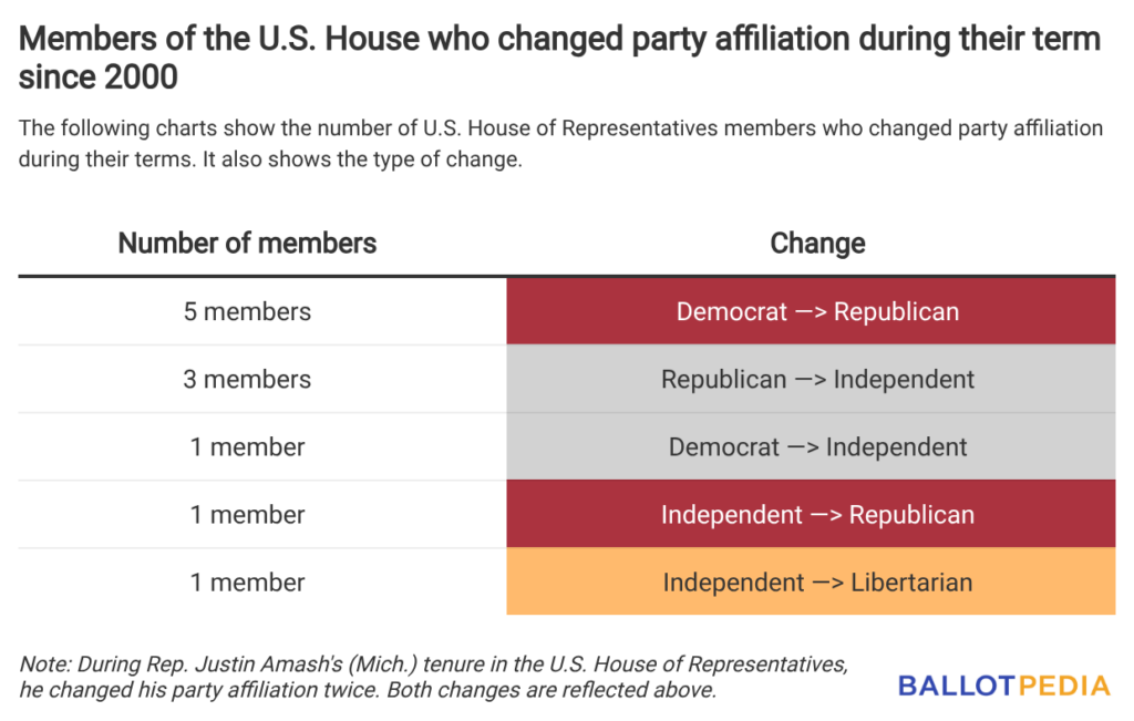 During this time, six Democrats, three Republicans, and two independents departed their respective parties. These departures resulted in six members becoming Republicans, one becoming a Libertarian, and four becoming independents. These figures account for Amash changing his party affiliation twice during his tenure.