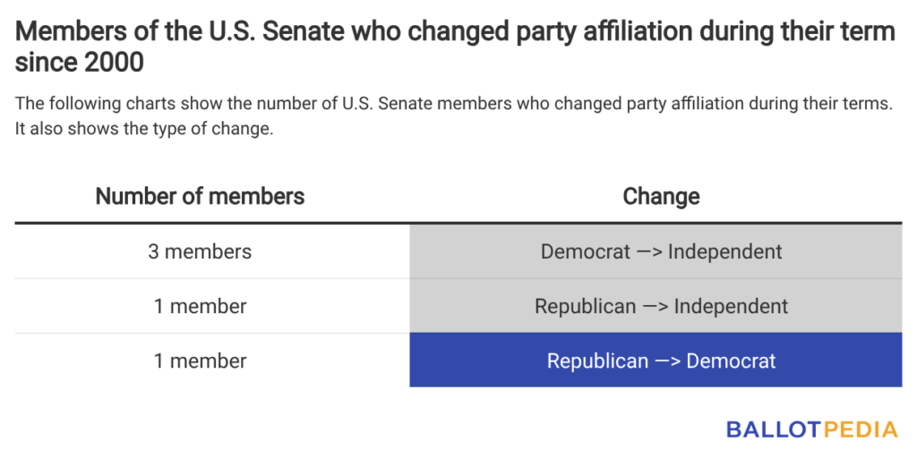 In the U.S. Senate, five members have changed their party affiliations since 2000. The last to do so was former Sen. Joe Manchin (W.Va.), who on May 31, 2024, changed his party affiliation from Democrat to independent.